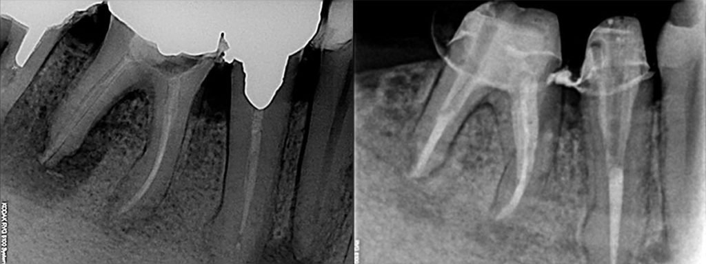 Si continua poi effettuando l’otturazione vera e propria dei canali radicolari con un materiale inerte (guttaperca) che li occupa tridimensionalmente. Questa procedura clinica deve essere effettuata con estrema precisione.